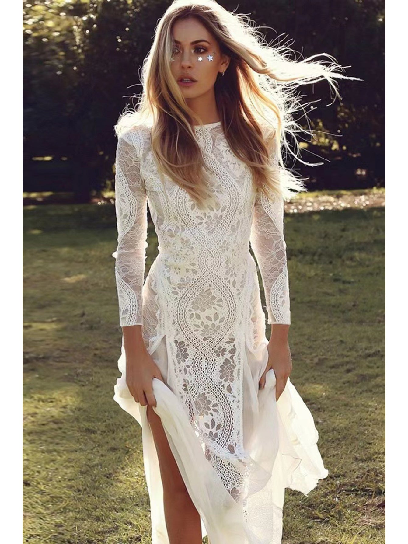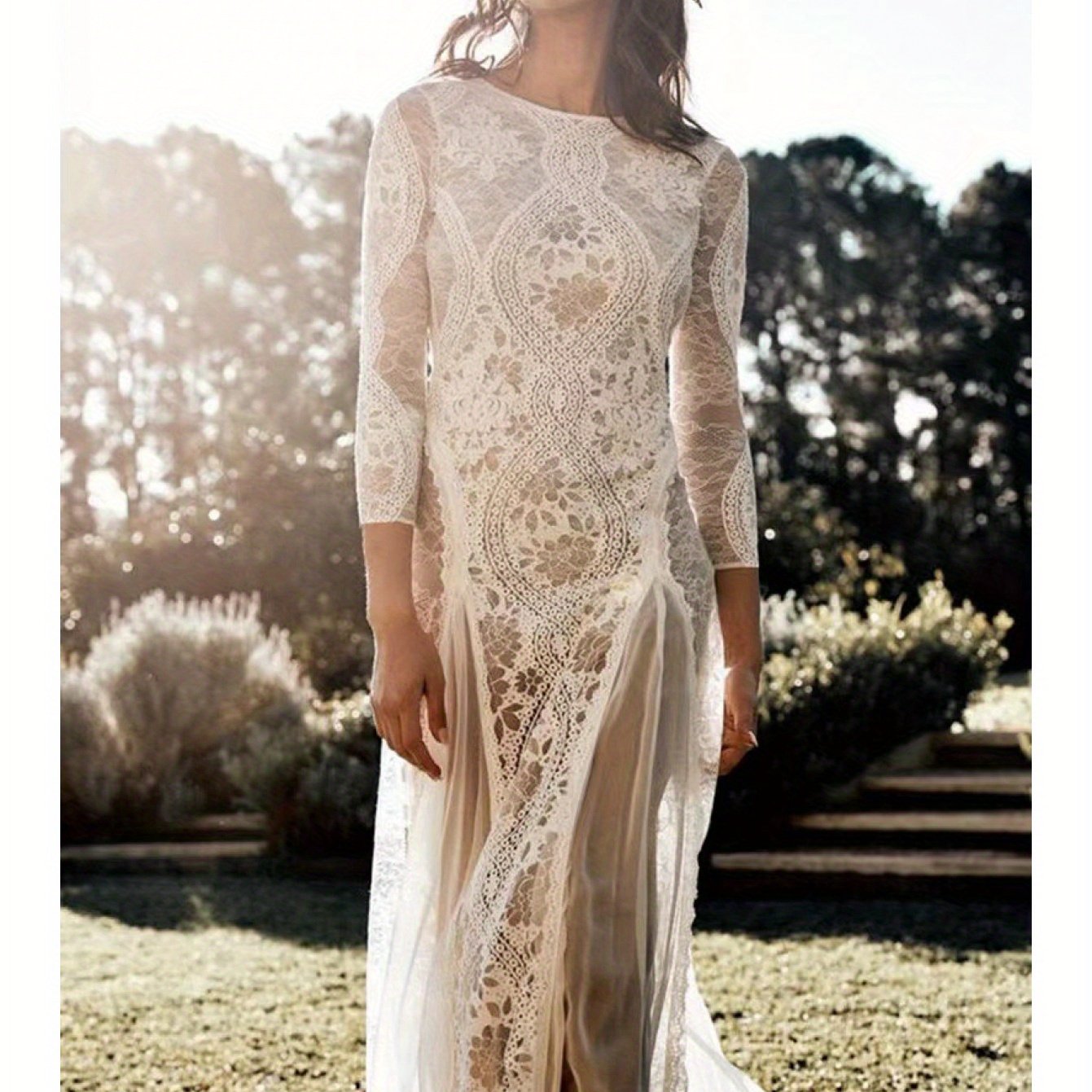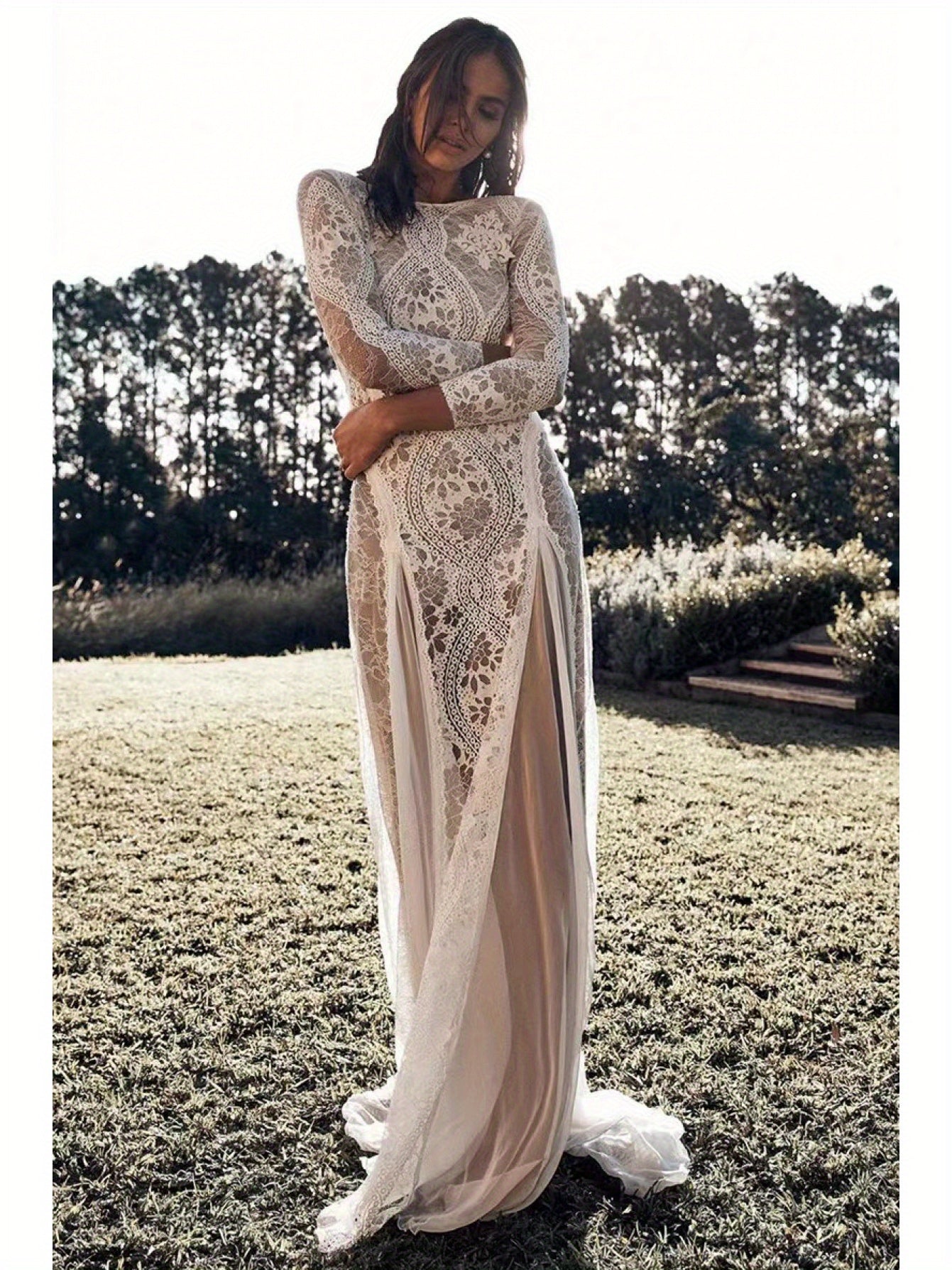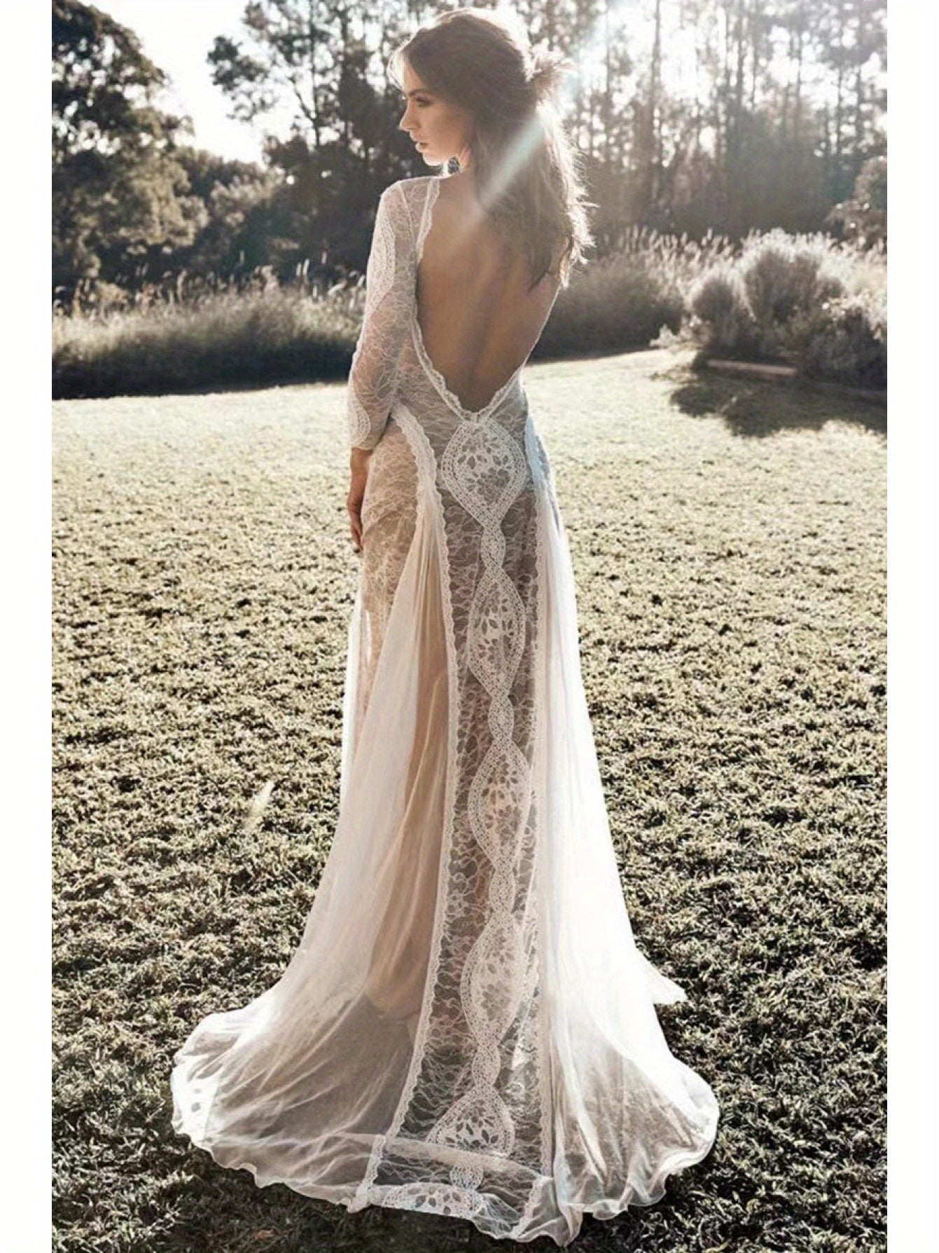 2025 European & American Women's Sexy Elegant Backless Lace Wedding Dress - Round Neck Long Sleeve A-Line Silhouette with Vertical Pleats, Machine Washable Bridal Gown for Weddings & Formal Events