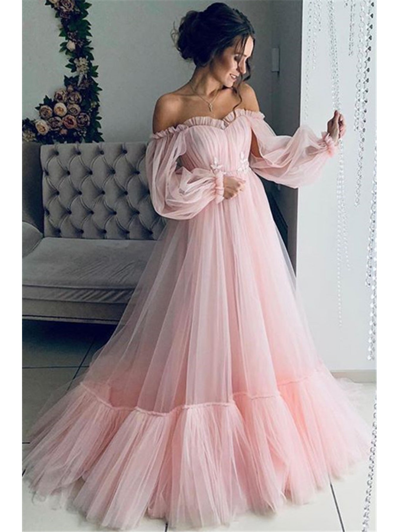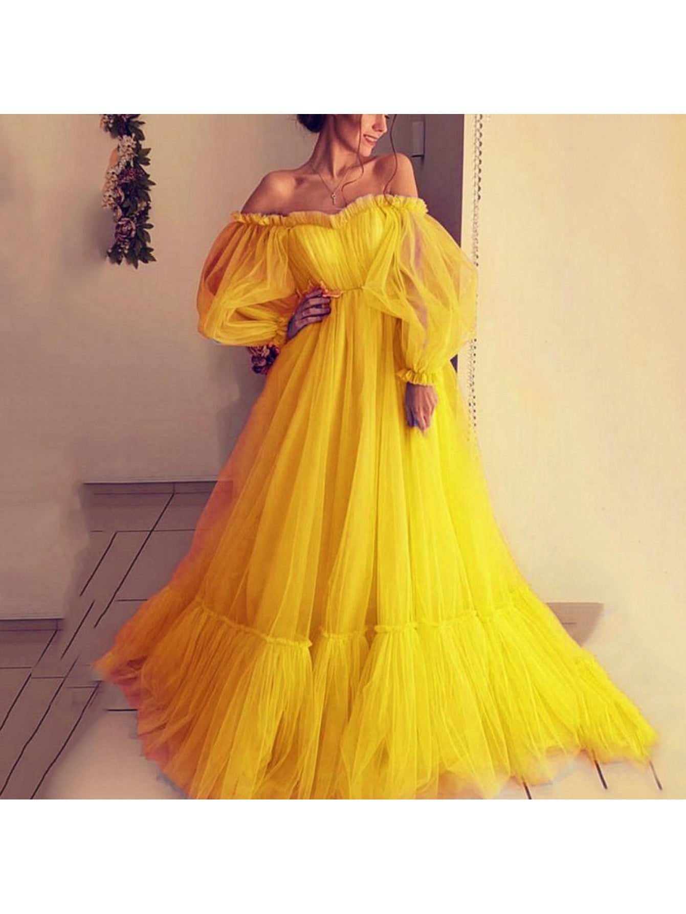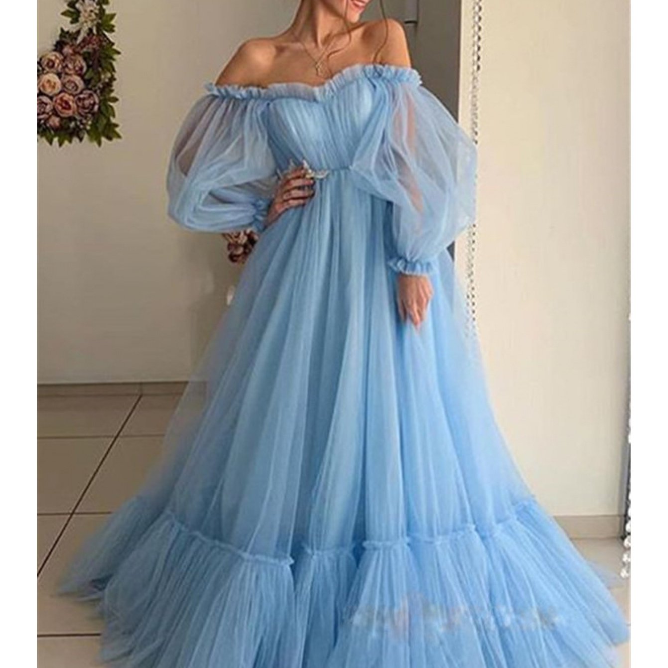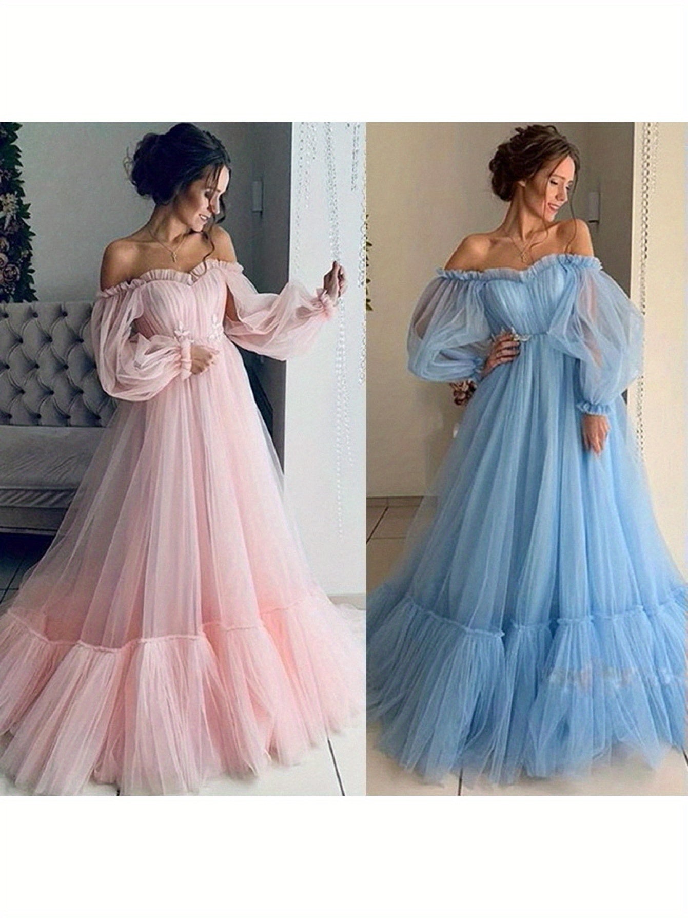 2025 New European and American Style Women's Fashion Off-Shoulder Mesh Long Sleeve Wedding Dress with Large Hem New Style