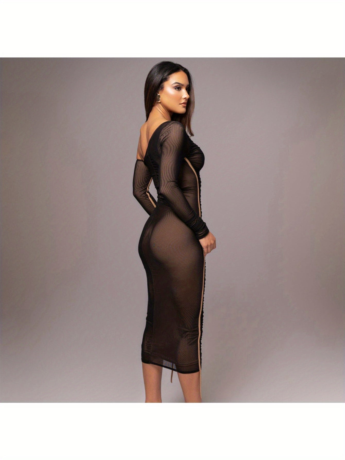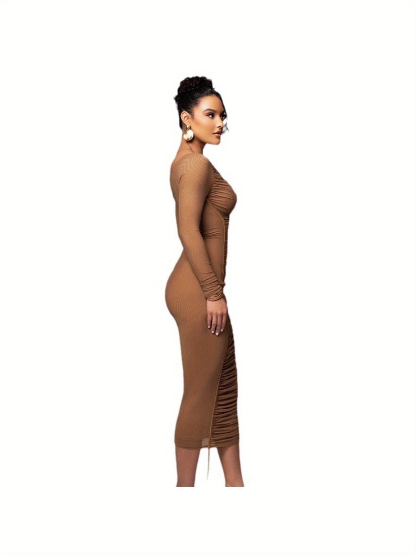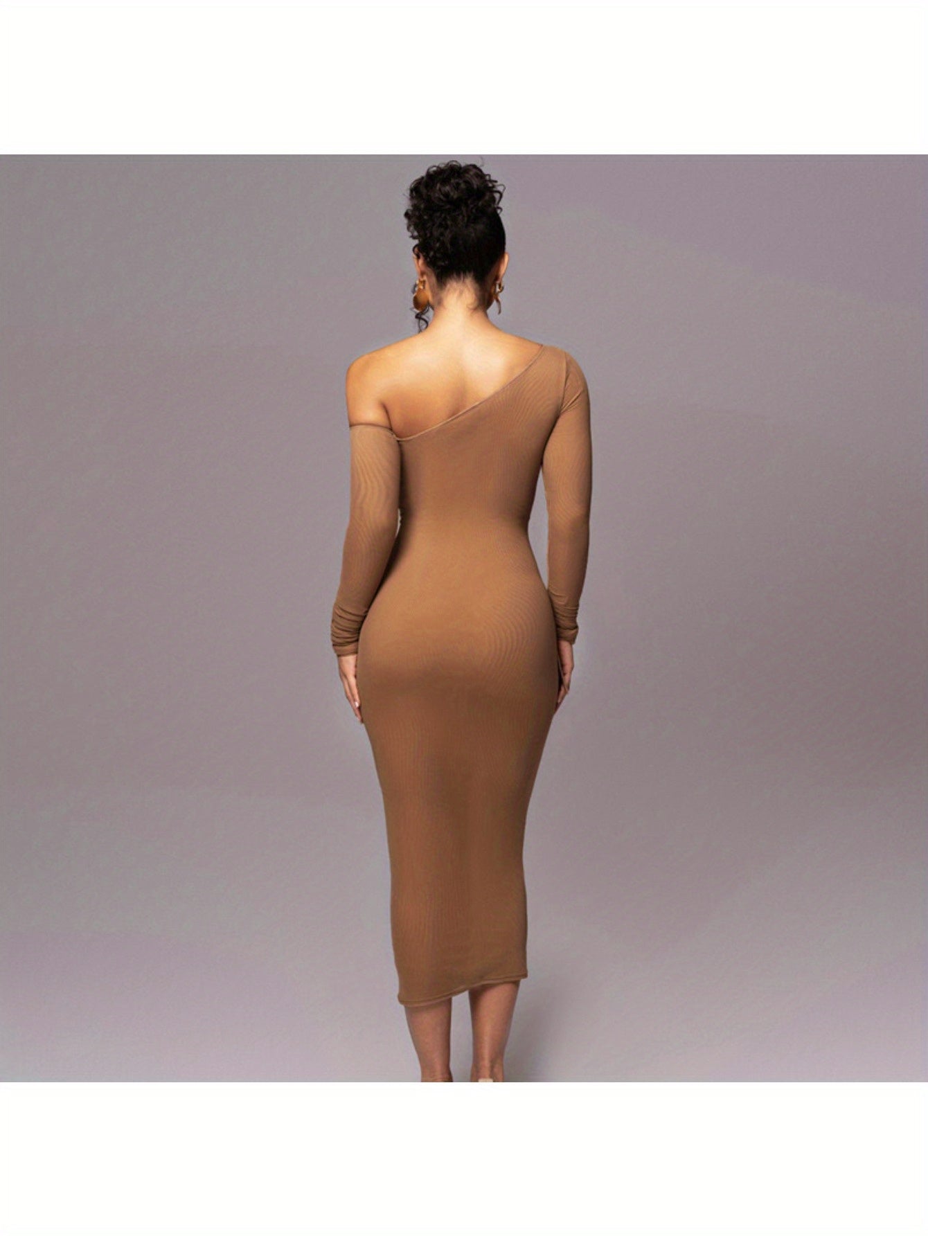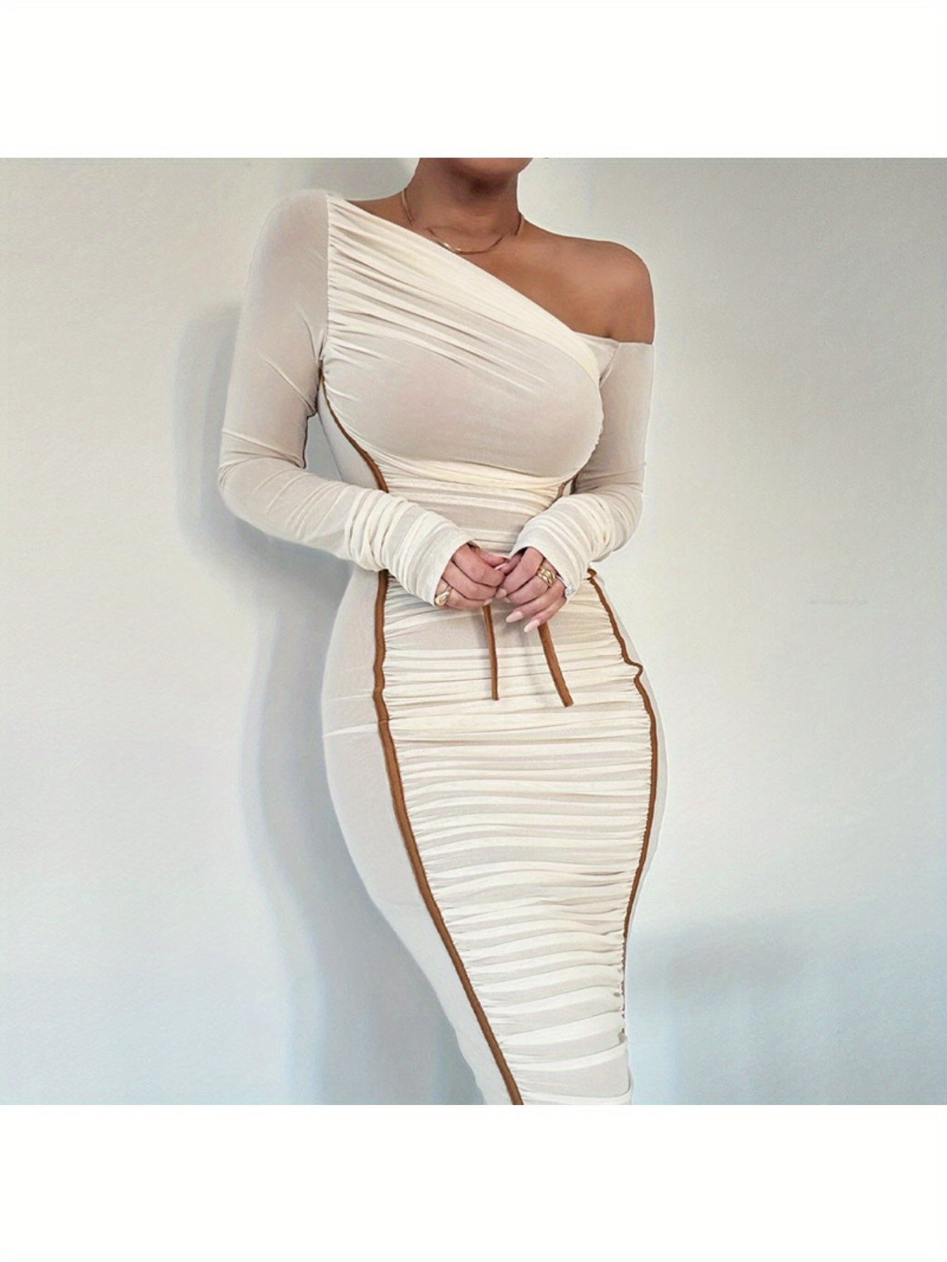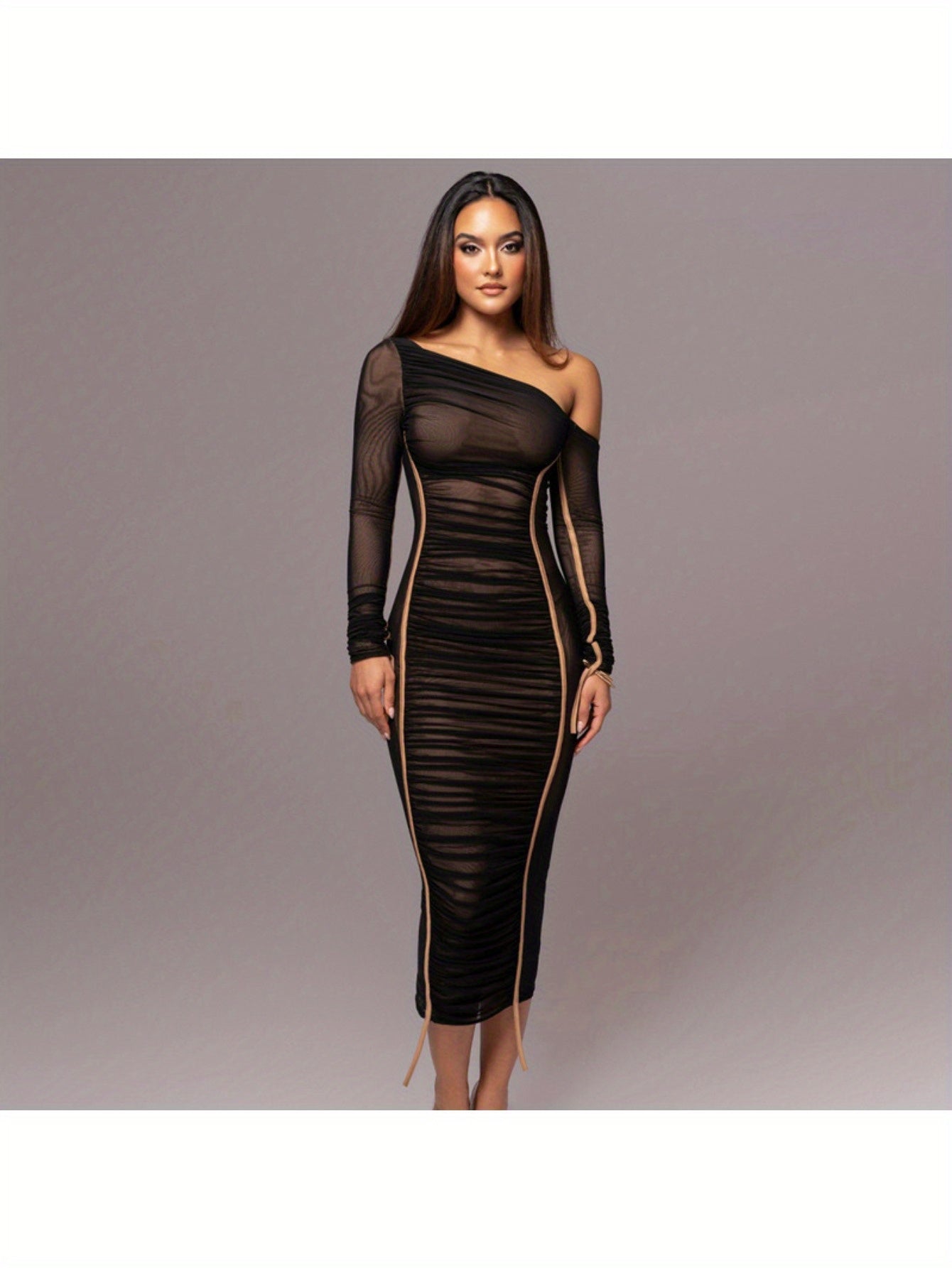Asymmetric Neckline Diagonal Neckline Long Sleeve High Waist Empire Waist Mesh Overlay Tulle Dress Bridesmaid Dress Date Night Dress Elegance Sophistication Sexy Alluring Intelligent Refined Polished Office Wear Work Attire Fall Winter Wedding Guests