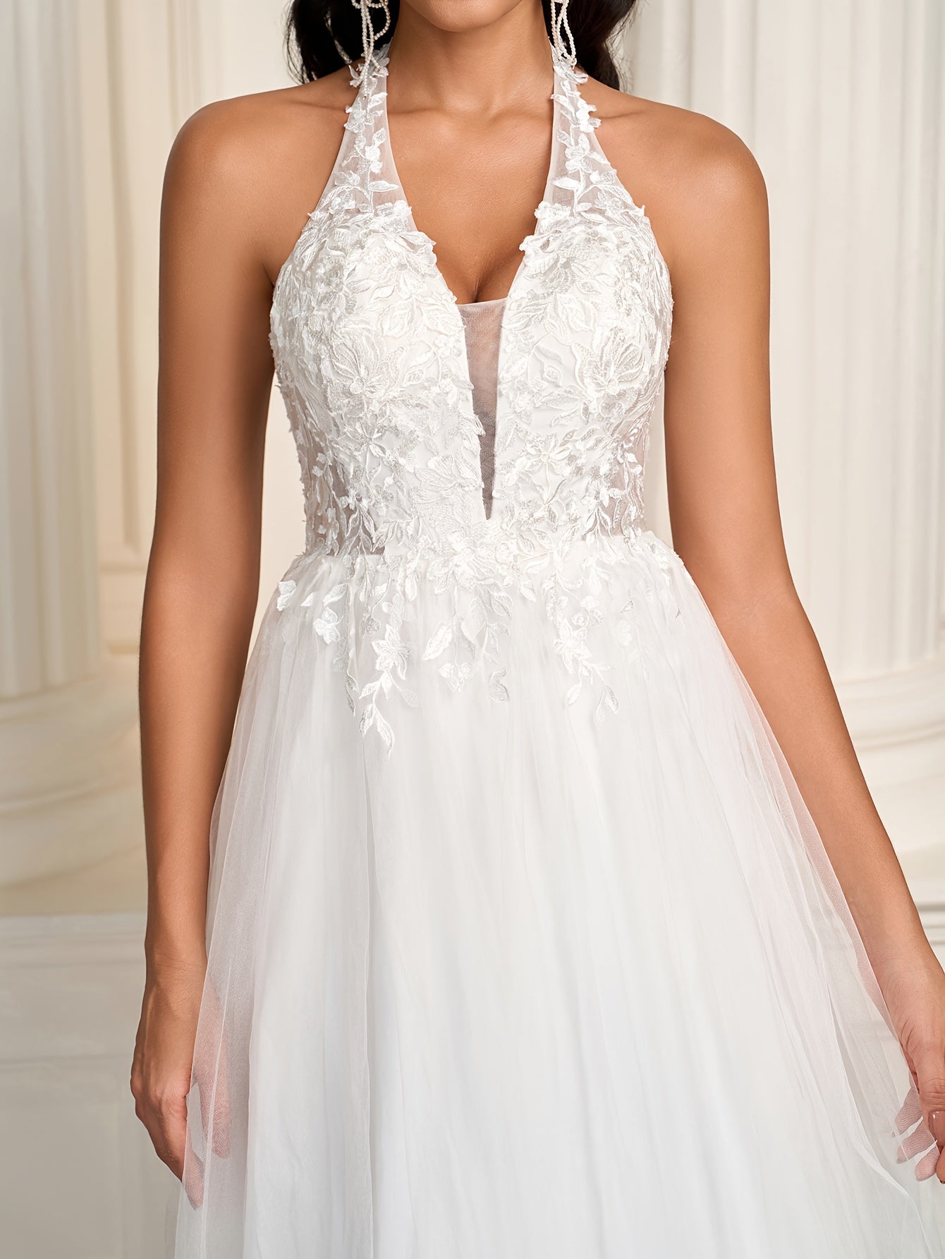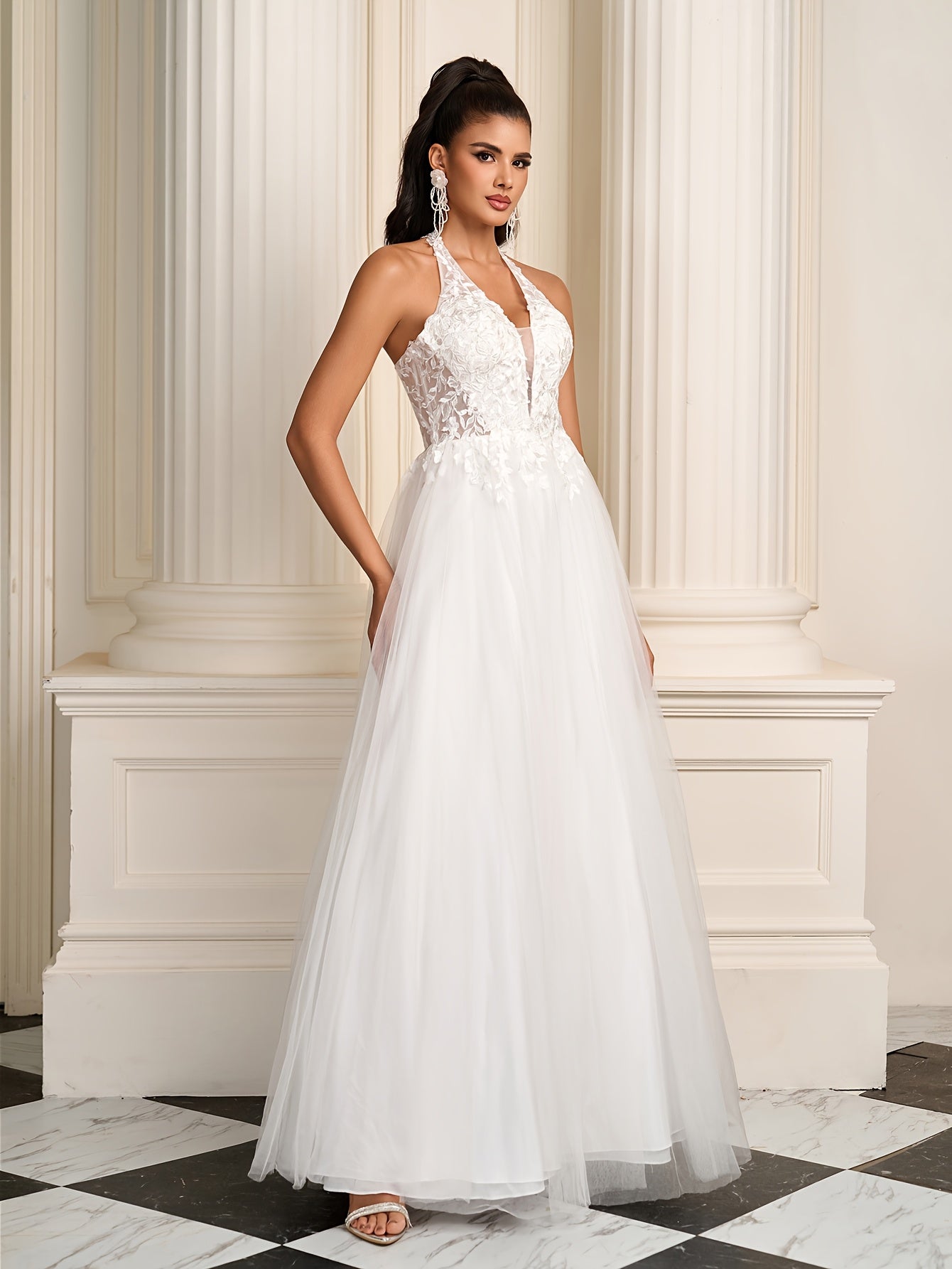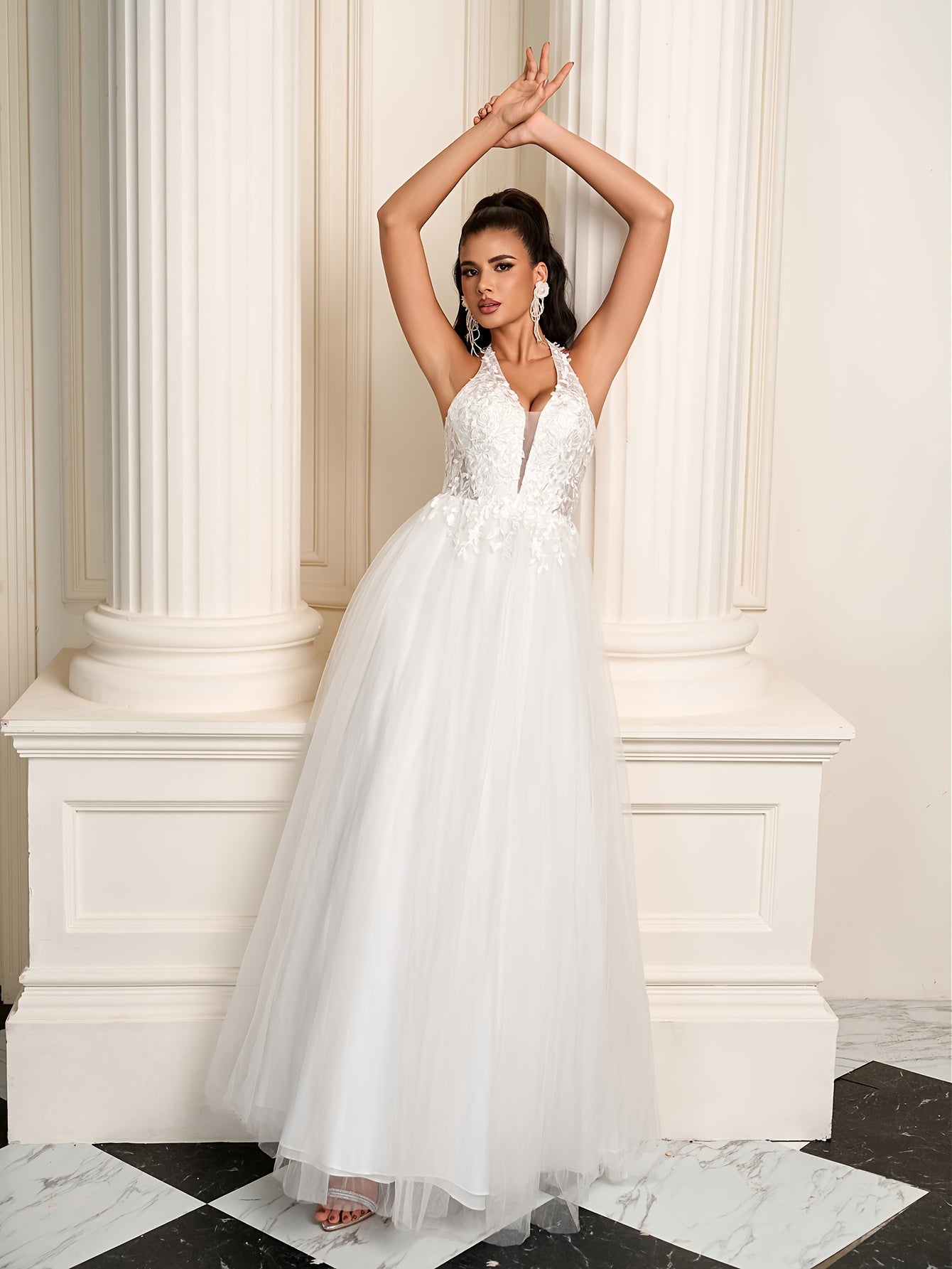 CANDYCE LEA Elegant Halter Neck Mermaid Wedding Dress with Deep V-Neck, Lace Embroidery & Tulle Skirt - Long Sleeveless A-Line Formal Gown for Bridal Ceremonies, Wedding Dresses for Bride, Ceremonial Attire, Sophisticated Craftsmanship