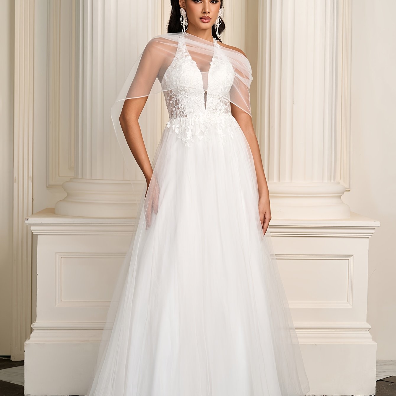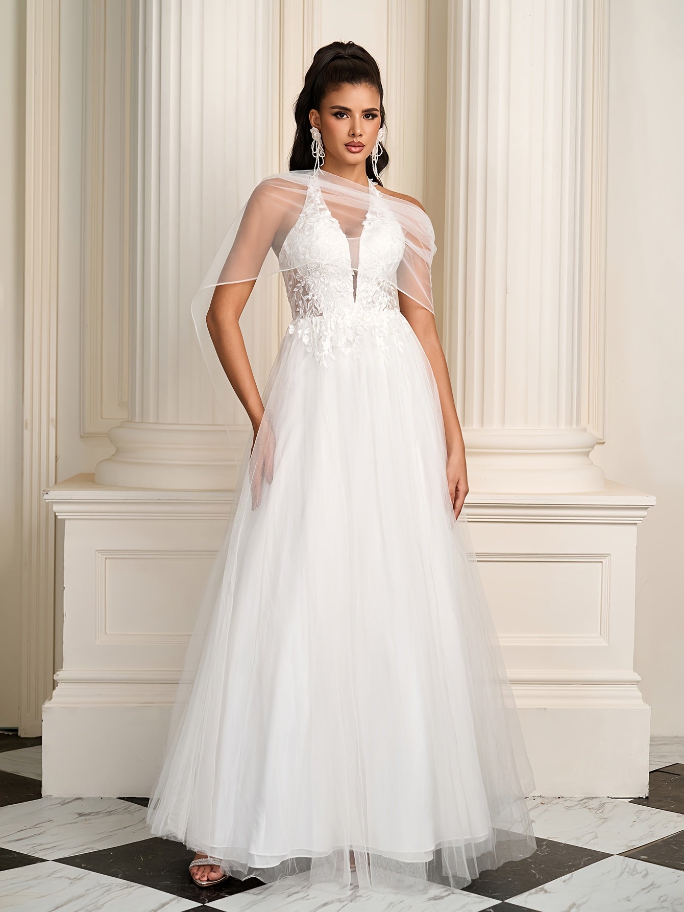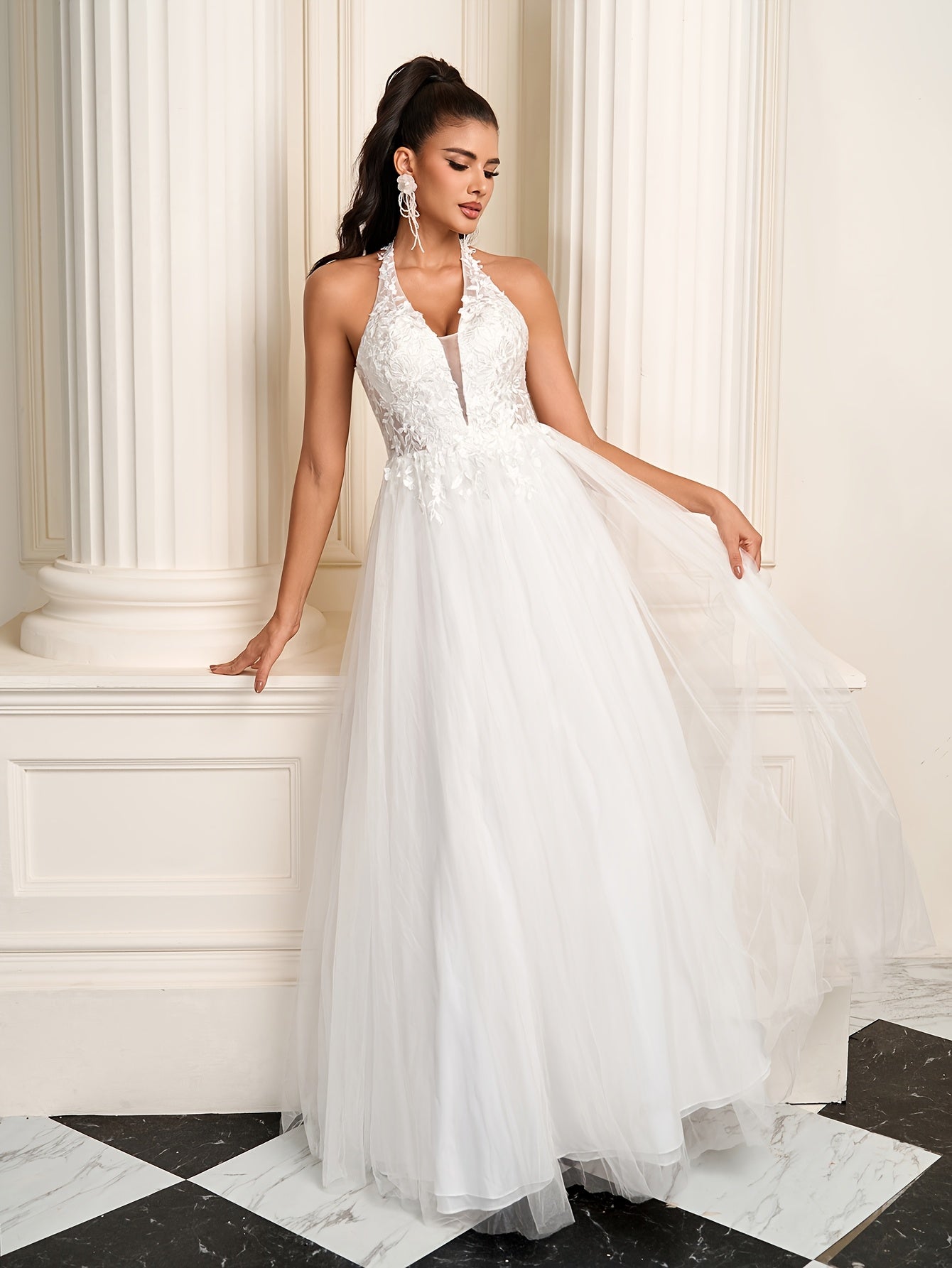 CANDYCE LEA Elegant Halter Neck Mermaid Wedding Dress with Deep V-Neck, Lace Embroidery & Tulle Skirt - Long Sleeveless A-Line Formal Gown for Bridal Ceremonies, Wedding Dresses for Bride, Ceremonial Attire, Sophisticated Craftsmanship