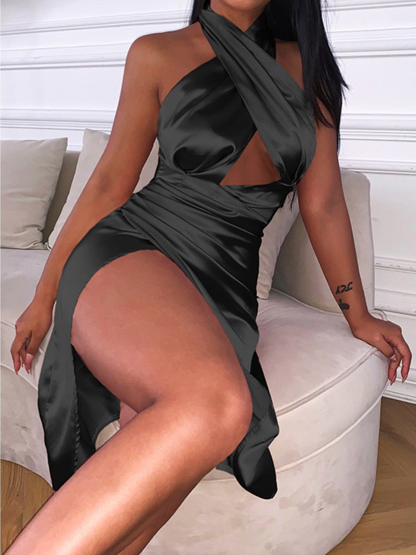 Elegant Black Satin Halter Neck Crisscross Backless Slit Gown - High-Slit Bridesmaid Dress for Weddings, Galas, and Formal Events, Bridal Dress, Wedding Guest Attire, Sophisticated Silhouette, Sleek Fitted Design