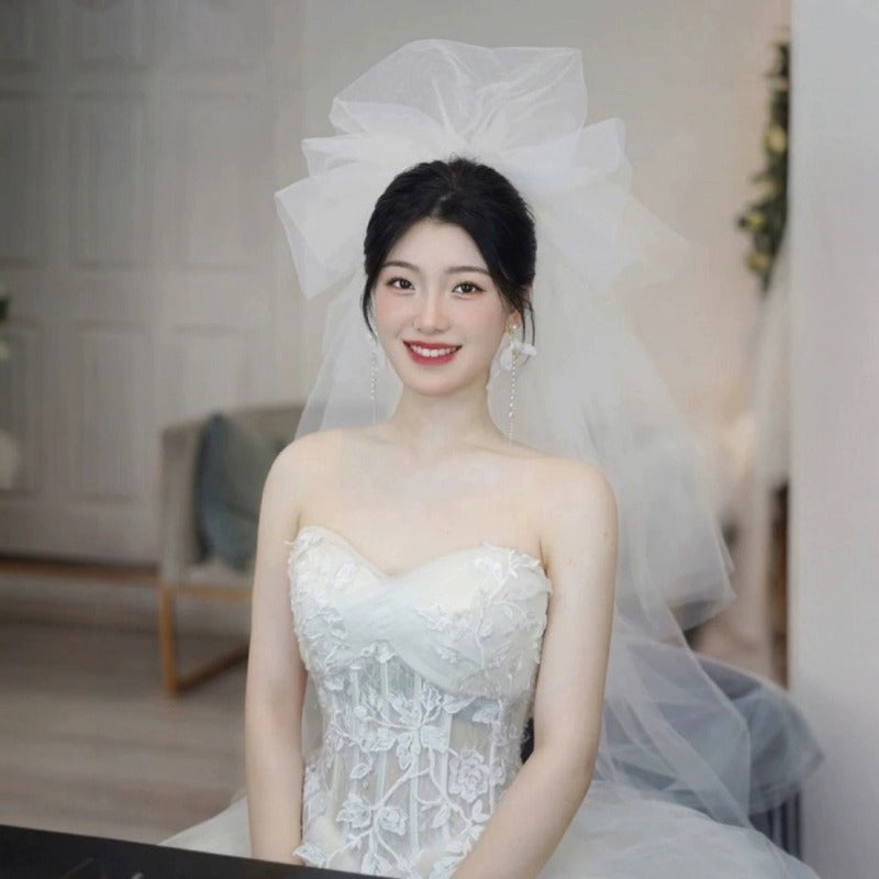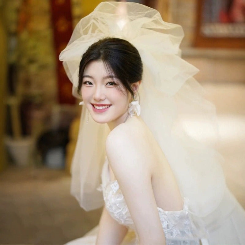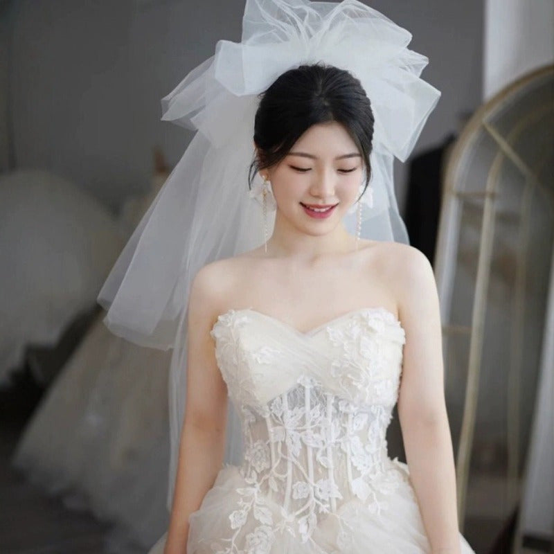 Elegant Korean-Style Wedding Dress with Fluffy Veil - White Lace & Tulle Bridal Gown, Ruffled Sleeves, and Floral Embellishments for Weddings, Photo Shoots, and Formal Events, Wedding Dresses for Bride, Event Elegance, Sophisticated Craftsmanship