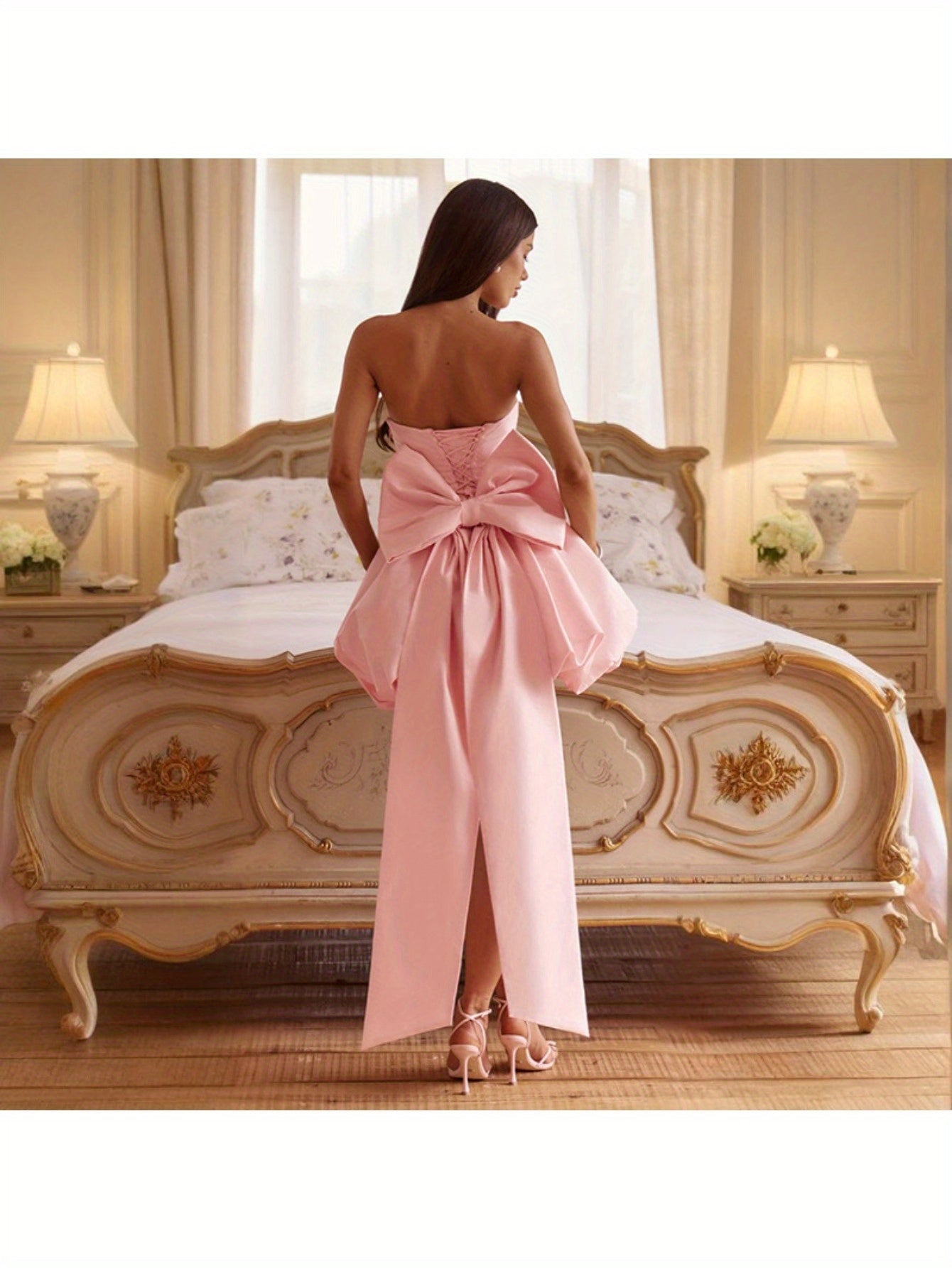 Elegant Off-Shoulder Ruffle Mini Dress with Large Bow Detail - Sleeveless, High-Low Hemline, Perfect for Weddings, Parties, and Formal Events, Formal Event Attire|Ruffle Detail Dress|Polyester Fabric