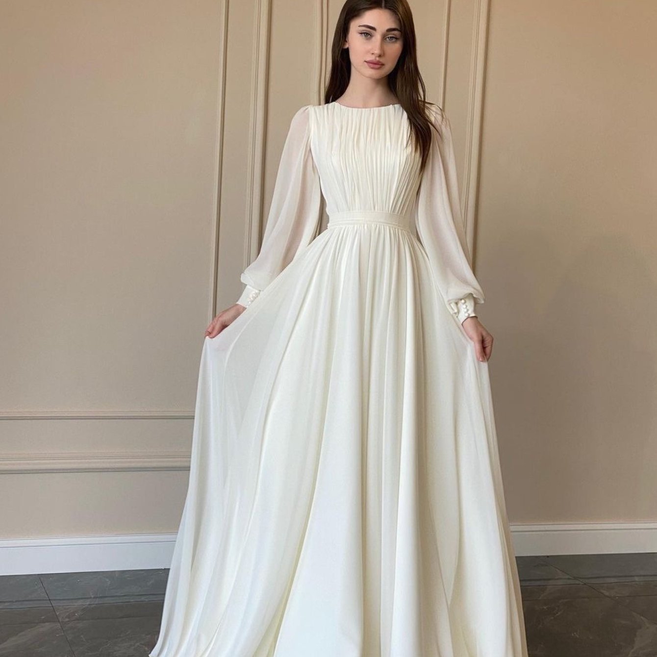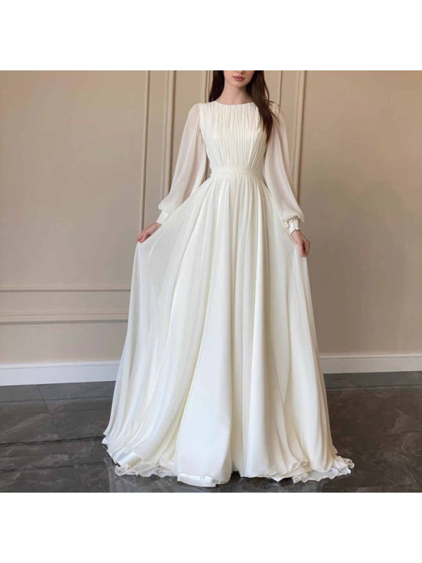 Elegant Wedding Dress Elegant White Satin Wedding Dress with Beaded Detail | Lantern Sleeves, Round Neck, Flowing Train - Perfect for Weddings and Formal Events, Wedding Dresses for Bride