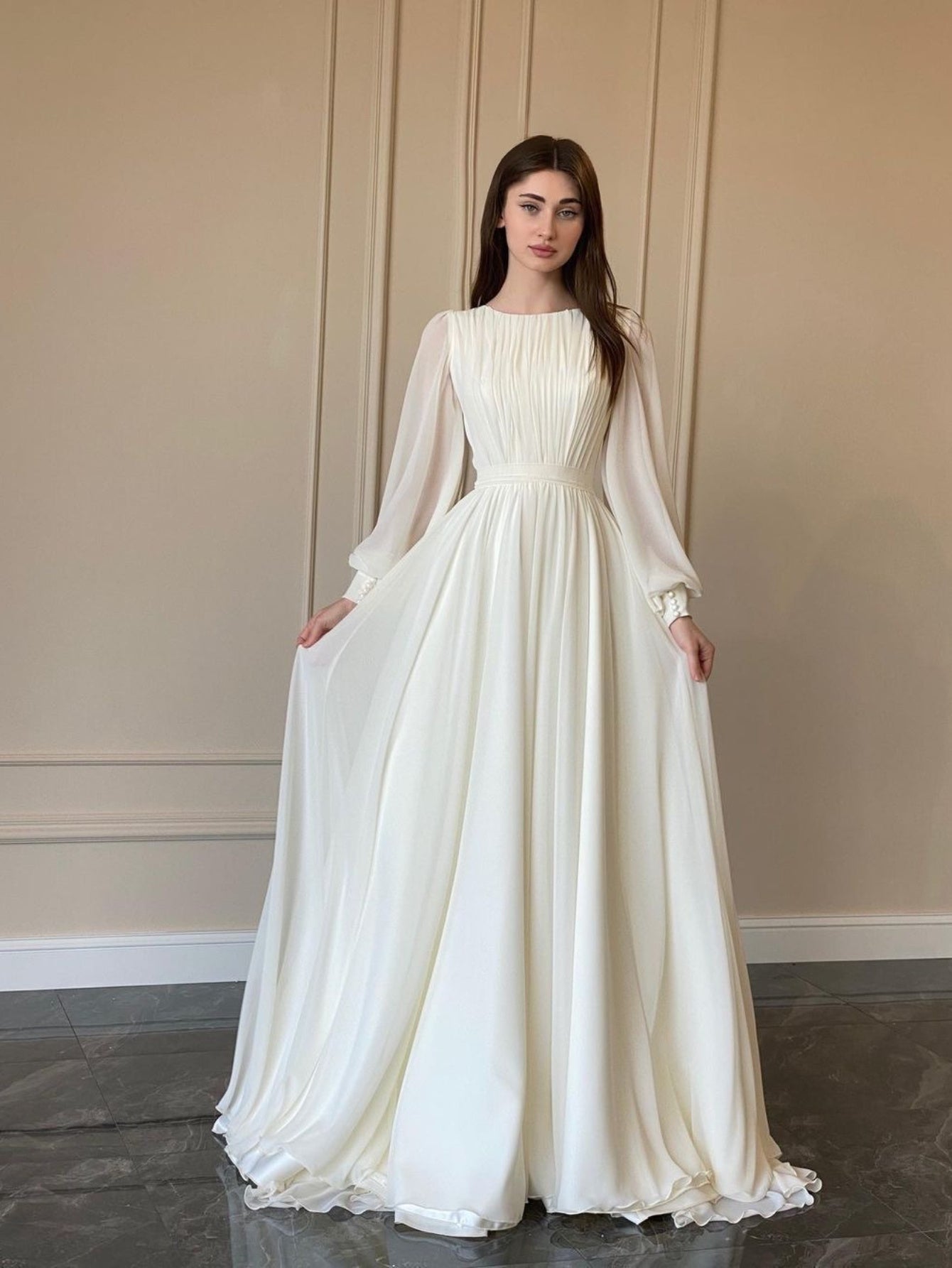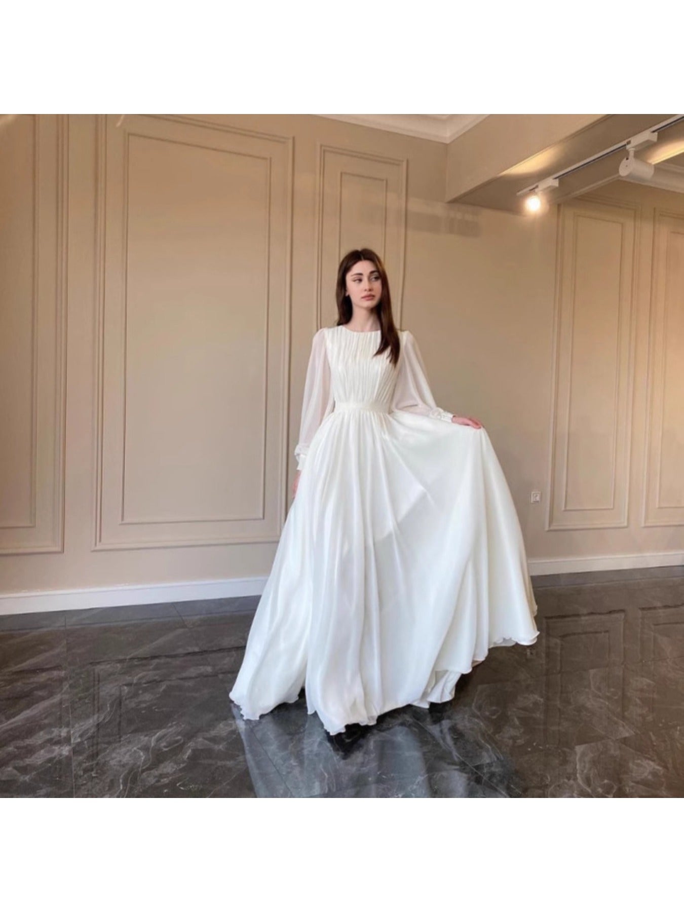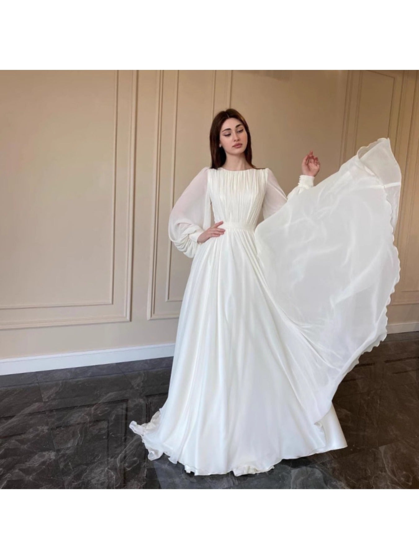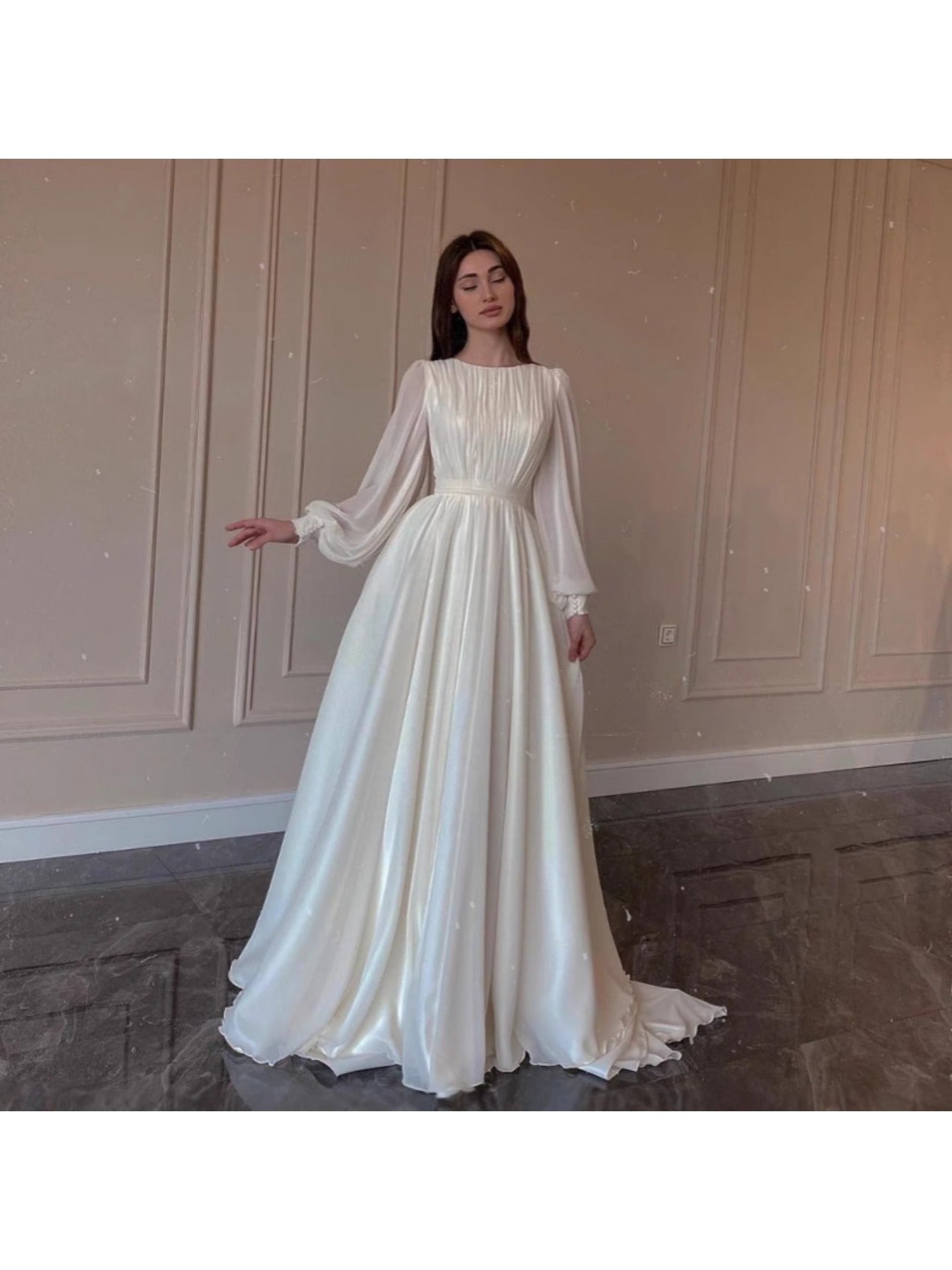 Pearlized Tulle Wedding Dress Pearlized Tulle White Wedding Dress | Lantern-Sleeved, Round-Neck Formal Long-Sleeved Gown