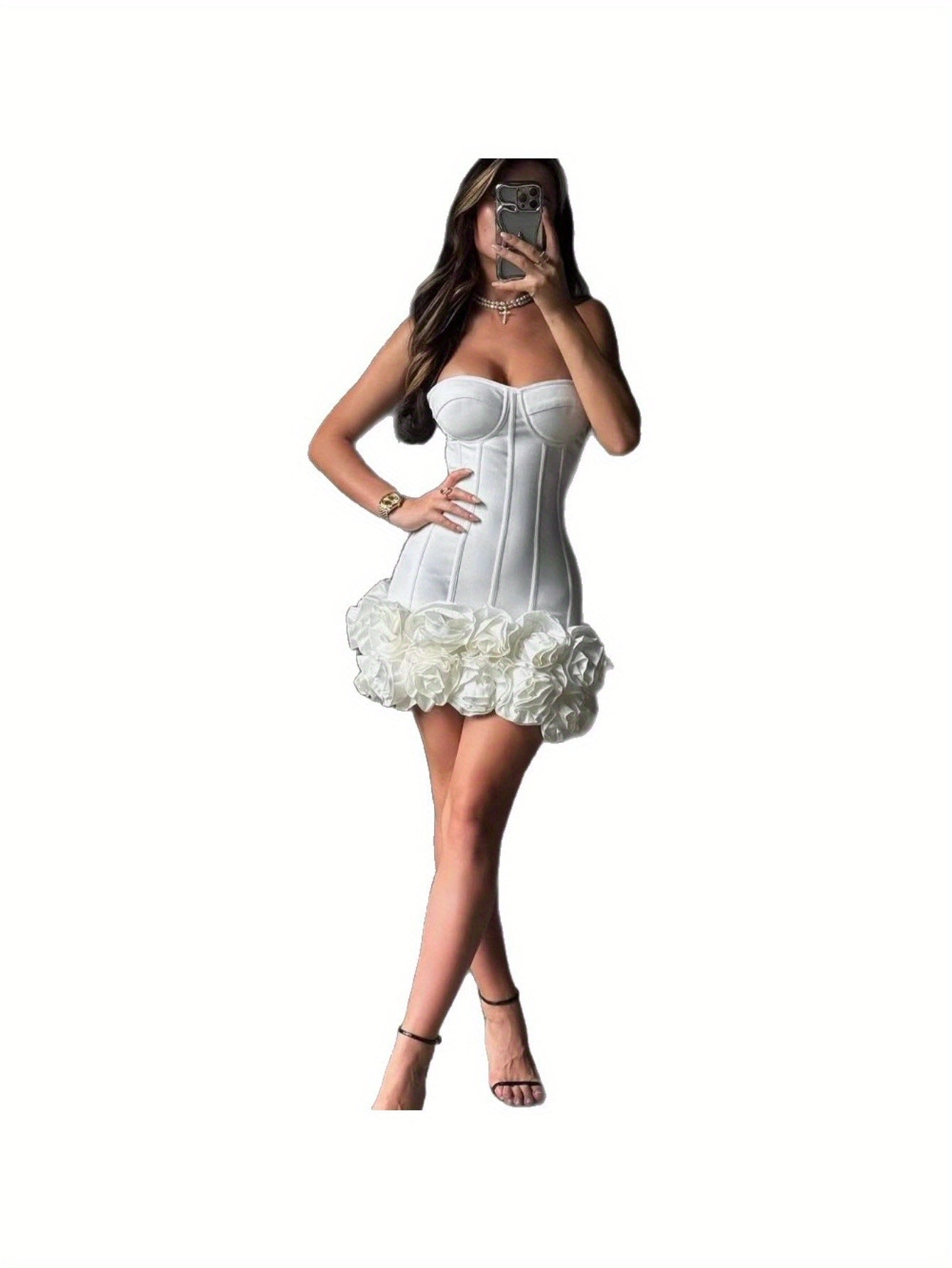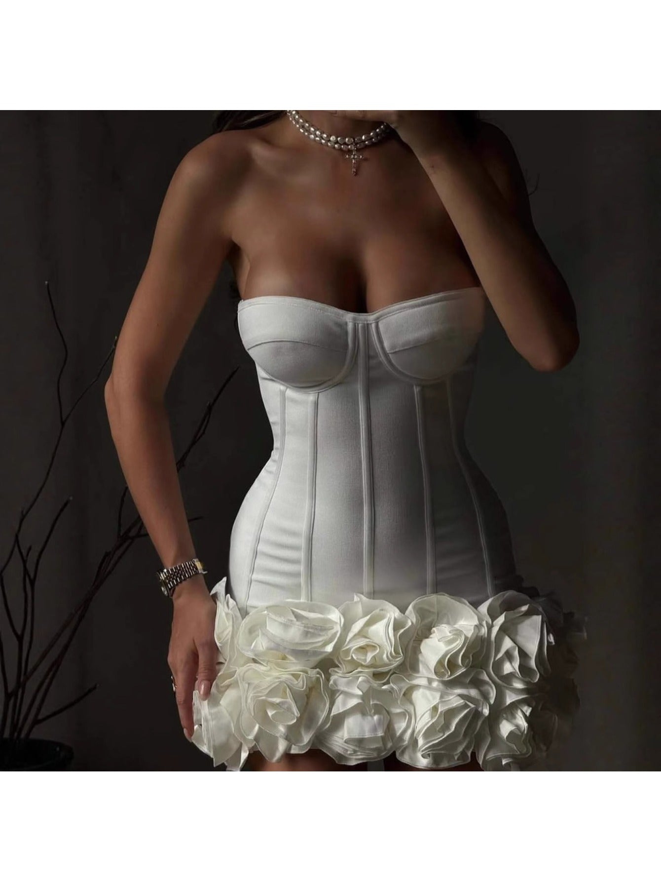 Women's Elegant 3D Handmade Floral Bandage Corset Mermaid\u002FTrumpet Mini Dress with Ruffled Hem & Long Sleeve\u002FStrapless Neckline - Structured Bustier Gown for Red Carpet, Cocktail Parties, Bridal Events - Spring\u002FAutumn Formal Evening Dress in