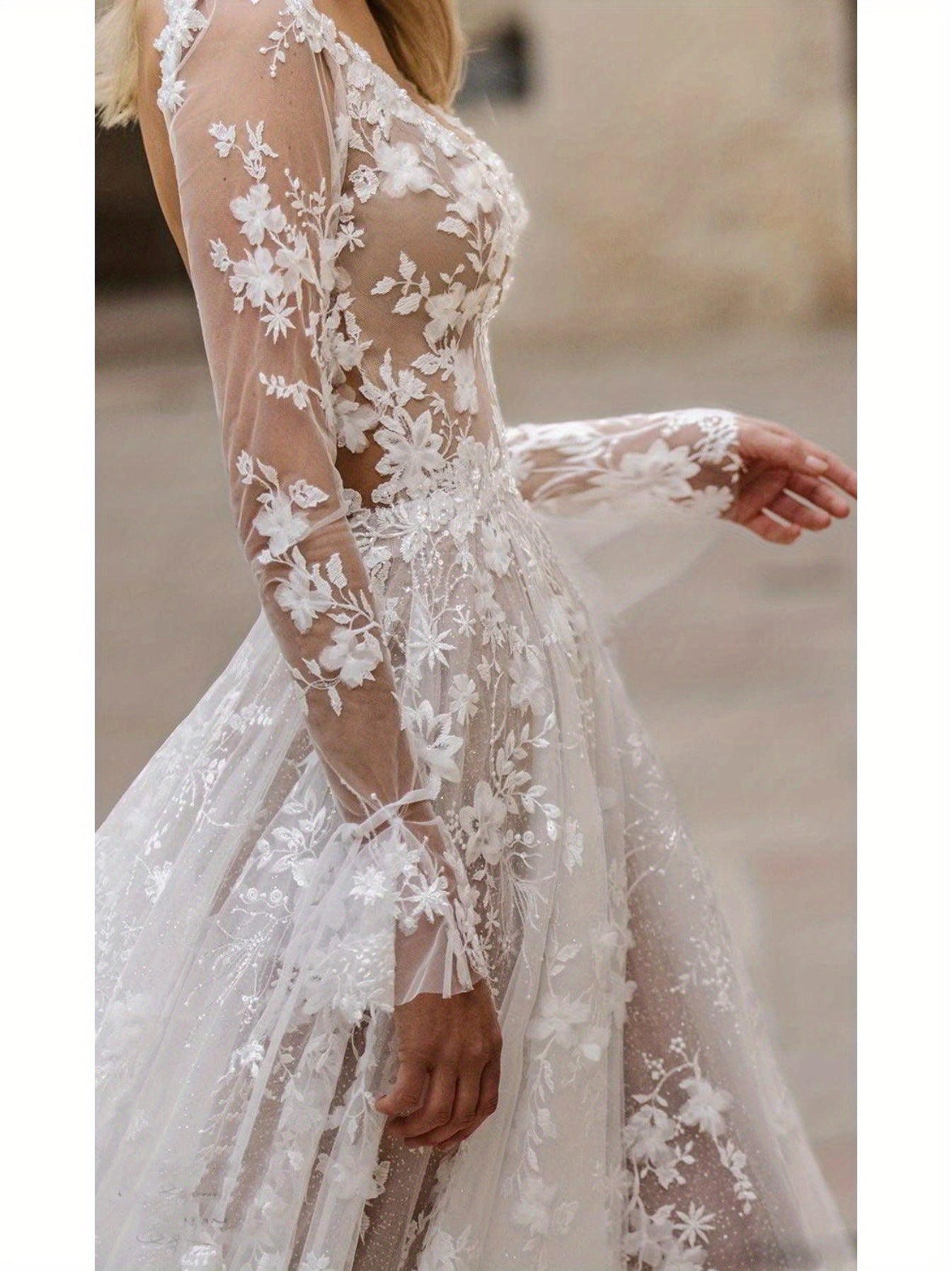 Women's Elegant Floral Lace Wedding Guest & Bridesmaid Dress - V-Neck Long Sleeve Semi-Sheer Floor-Length Evening Gown with Mermaid Silhouette for Weddings & Formal Events, Wedding Dress, Delicate Fabric Detail
